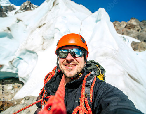 A dynamic selfie of a rock climber surrounded by glaciers, showcasing icy terrain, snow-covered peaks, and essential climbing equipment in an epic alpine setting.