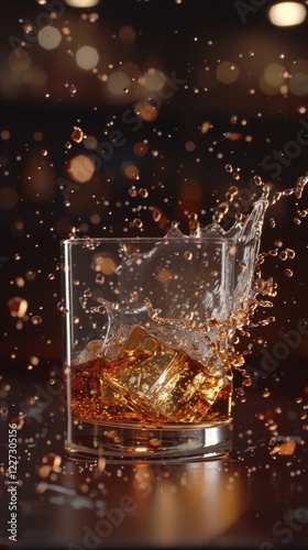 A dynamic shot of a drink with ice and sprinkles, perfect for alcoholic drinks and bar adverts.