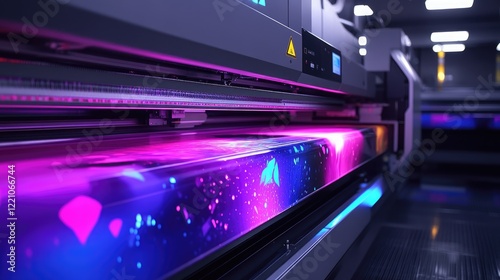 A dynamic shot of an industrial inkjet printer releasing vibrant colors onto large format media in a high-tech production environment.