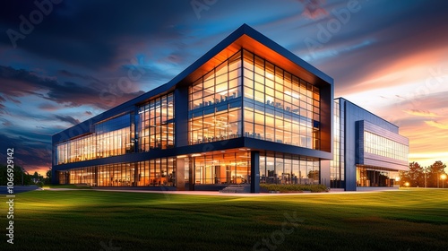 A dynamic view of an office building at dusk with illuminated windows, ideal for showcasing a vibrant business environment or corporate achievements.
