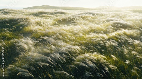 A dynamic wind effect blowing through a field of tall grass, bending the grass in synchronized waves of movement.