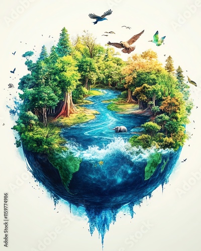 A dynamic World Environment Day illustration with a colorful globe, clean rivers, forests, and wildlife, showcasing a vibrant ecofriendly future