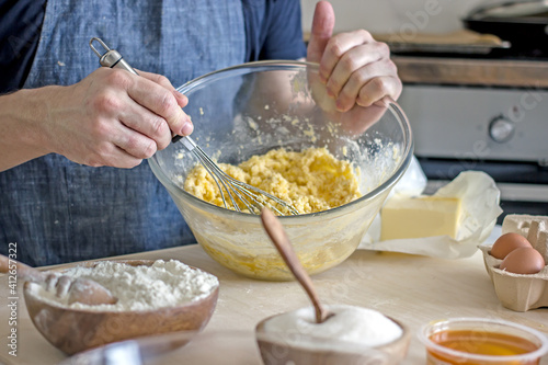 A faceless man in an apron kneads cookie dough with honey, flour and butter on the kitchen table with ingredients. Authentic hobby home baker. Close-up of a glass cup with dough and hands with a whisk