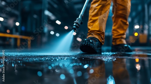 A factory worker blasting dirt off the floor with high-pressure cleaning equipment, cyberpunk style, neon blue lighting, wet surface reflections, low-angle shot