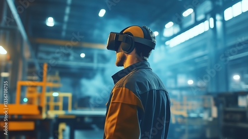 A factory worker using VR for industrial training in a high-tech setting.