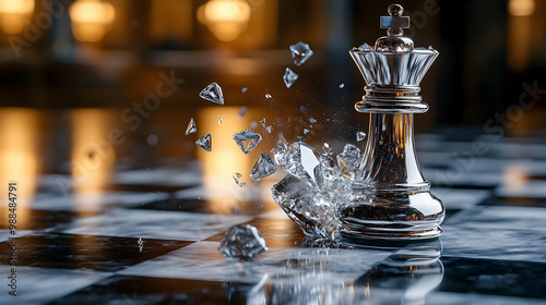 A fallen chess king on a black and white board, surrounded by shattered glass pieces, showcasing a dramatic moment.