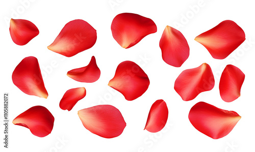 A falling or flying red rose flower petals isolated on a transparent background [PNG].