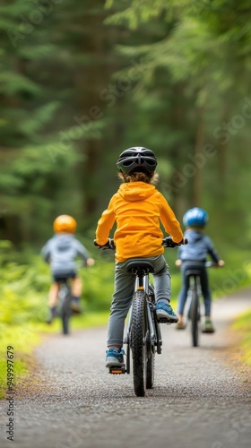 A family cycling together on a scenic trail, with parents leading the way and children following, everyone wearing helmets and enjoying the ride