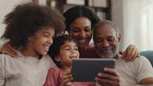 A family engaged in a video call using wireless technology, with everyone gathered around a device.