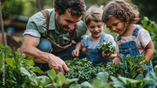 A family enjoying a day at an organic farm, picking fresh produce and learning about sustainable agriculture