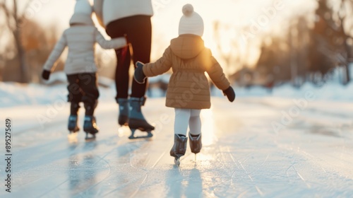 A family enjoys ice skating on an outdoor rink, with children and an adult holding hands and gliding over the ice, surrounded by the serene beauty and cold of winter.