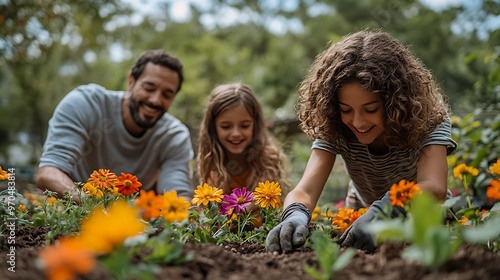 A family gardening together, planting vibrant flowers in a sunny backyard, the kids digging into the soil with their hands, parents smiling, the soft breeze rustling the trees, creating a warm,