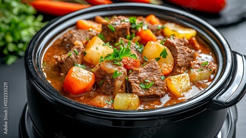 A family gathered around the dining table savoring a delicious and hearty slow cooker beef stew on a cold winter evening