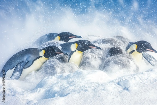 A family of emperor penguins huddling together in a blizzard, protecting their eggs