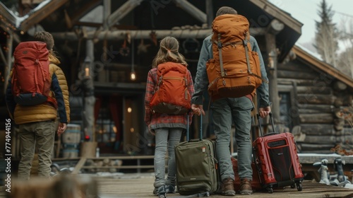 A family of parents and children arriving at a wooden house in the snow in winter with backpacks and suitcases.