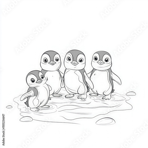 A family of penguins waddling on ice, coloring page for kids, simple outline illustration. Coloring book, simple lines.