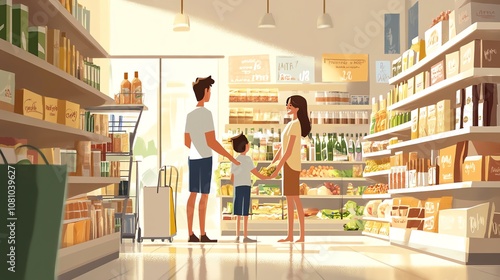 A family of three shopping for groceries in a brightly lit grocery store with aisles stocked with various products.