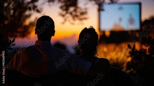 A family silhouette watching a movie projected on an outdoor screen in the evening