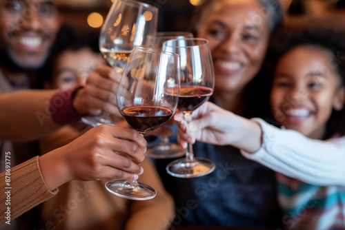A family toasting with wine glasses, celebrating Thanksgiving. Concept for family gatherings and holiday celebrations