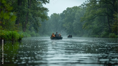 A family with their pets boating down a forest river, navigating through calm waters and enjoying the scenic views realistic photo, high resolution , Minimalism,
