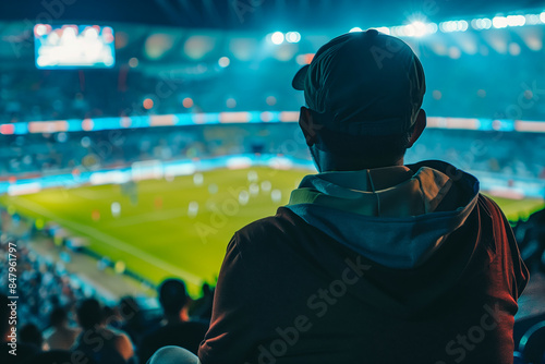 A fan is watching football at the stadium, rear view
