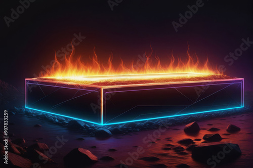 A fantastic landscape with a burning neon figure.