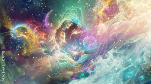 a fantastical abstract wonderland brimming with vibrant hues and surreal shapes, surrounded by a spacious white space for text