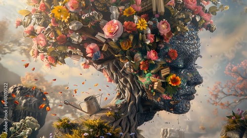 a fantastical sight unfolds as a resplendent tree emerges from the side of an open human head,