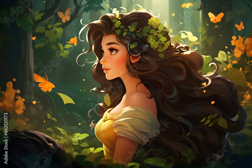 A Fantasy Character Amidst a Lush World of Flora and Fauna. A Captivating Fairytale Background Illustration with a Strong Female Protagonist