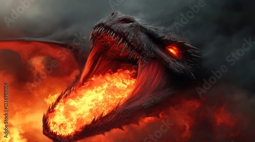 A fantasy scene of a dragon breathing fire onto an ice-covered mountain