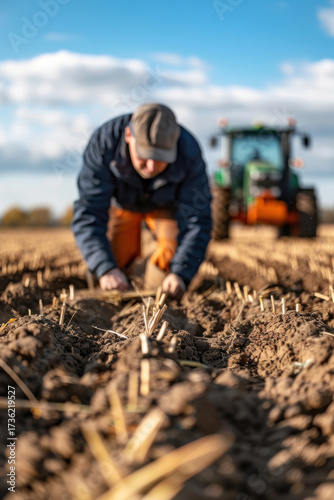 A farmer carefully plants seeds in a wheat field, focusing on the task at hand. The tractor is blurred in the background, emphasizing manual labor and connection to nature.