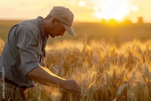 a farmer examines wheat sheaves closely, amidst a field of ripe grain golden-hour light