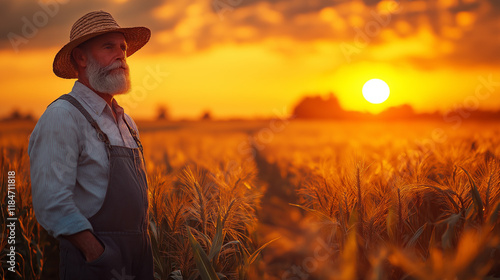 A farmer in overalls and a hat walking through a field of tall stalks as the golden sun rises in the background