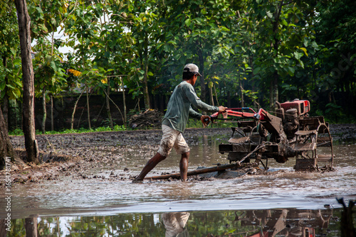 A farmer is using a hand tractor in a muddy rice field.