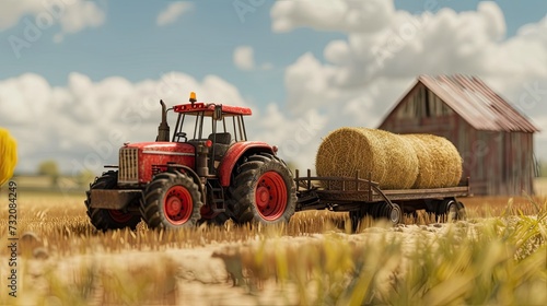 a farmer operating a tractor to load round hay bales onto a trailer, showcasing the agricultural process of harvesting and transporting straw bales with authentic realism and detail.