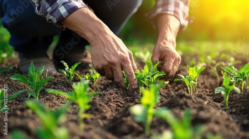 A farmer planting young seedlings in rich, dark soil during a bright sunny day, showcasing growth and sustainability in agriculture.