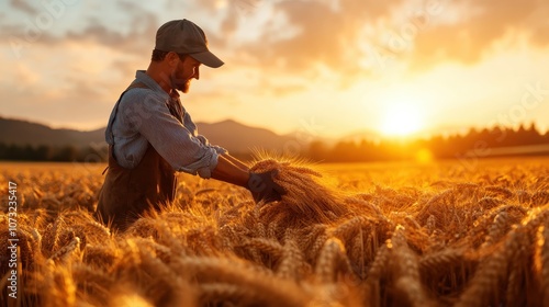 A farmer stands in a golden wheat field during sunrise, gathering ripe grains, representing dedication, growth, and the rural way of life in harmonious surroundings.