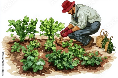 A farmer tending to a lush vegetable garden, cultivating fresh produce with care and expertise in a vibrant outdoor setting.