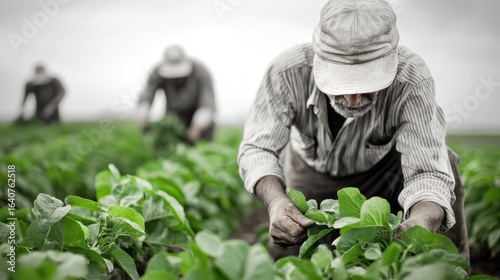 A farmer tends to crops in a lush green field, demonstrating dedication to agriculture and hard work amidst a tranquil landscape.