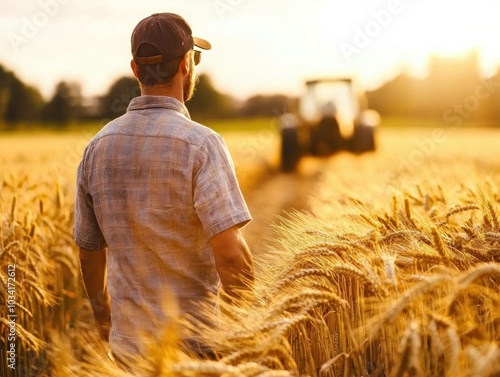 A Farmer Watching His Tractor Work in Golden Wheat Fields at Sunset Embracing the Beauty of Agriculture and Nature's Bounty