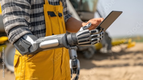 A farmer with a prosthetic arm uses a tablet in the field. Modern technology and agriculture.
