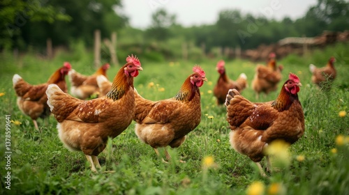 A farming community working together on sustainable chicken, pork, and beef production, using eco-friendly methods,