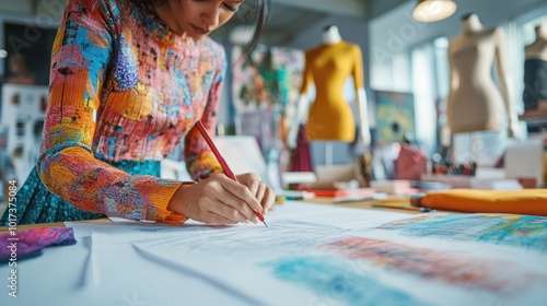 A fashion designer in a vibrant studio creating a rough sketch draft of a new clothing line, mannequins in the background and various fabric samples on a table.