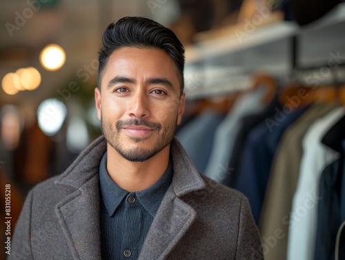 A Fashion Designer male wearing stylish designer attire, standing in front of a clothing rack, smiling and looking into the camera