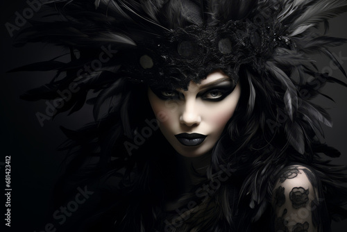 A fashion model with black feathers in her hair, in the style of bold shadows, dark fairy tales, monochromatic palettes.