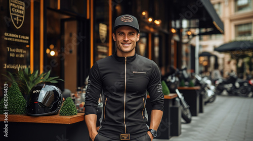 A fashionable biker with a custom-painted helmet, standing tall with their classic cafe racer