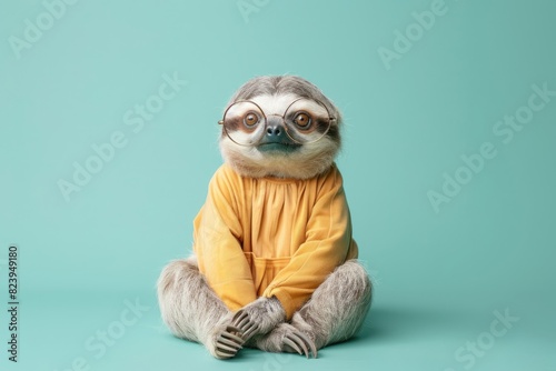 A fashionable sloth in a retro dress and round glasses, sitting cross-legged and looking stylishly nonchalant, isolated on a solid mint green background.