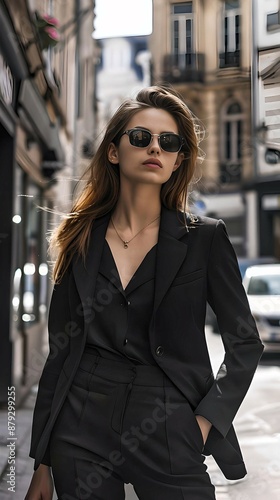 A fashionable woman in a black suit walking downtown, showcasing modern style and urban sophistication.