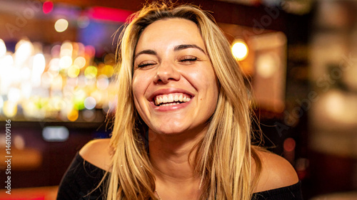A fashionable woman with long blonde hair and a black off-the-shoulder top enjoys the warm glow of a lively bar setting. Colorful lights and blurred bottles create a dynamic background, evoking themes