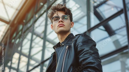 A fashionably dressed man in glasses and a leather jacket stands outside a modern building, looking upwards, exemplifying a sense of curiosity and forward-thinking attitude.